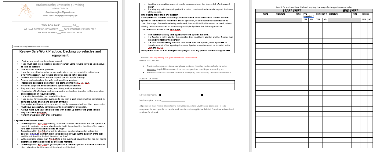 The Backing up Vehicles and Equipment Safe Work Practice template contains the information needed to plan and complete the task. It meets industry standards and OH&S requirements.