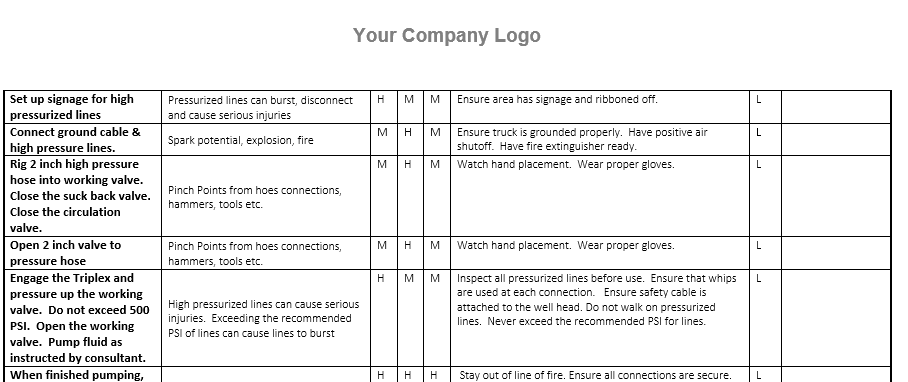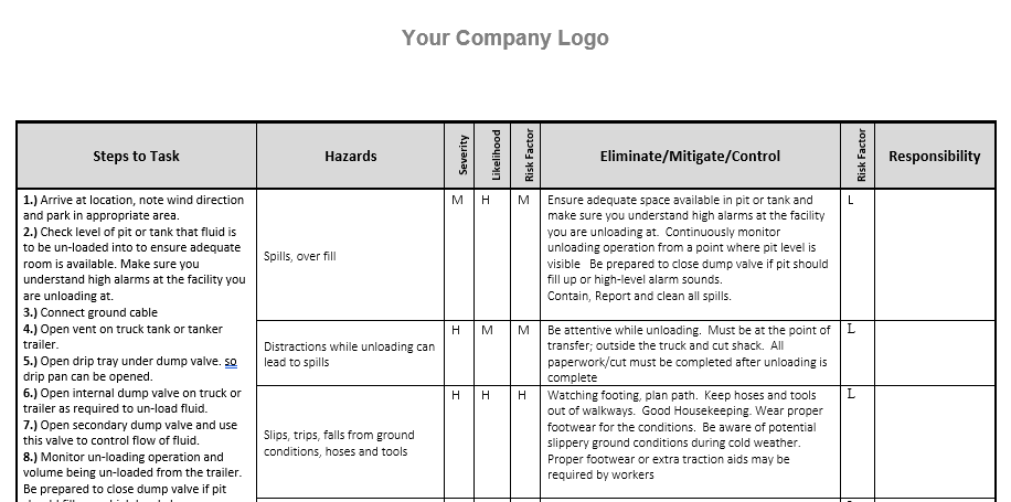 This Safe Job Procedure is filled out with the steps, hazards, and corrective actions for the task of Unloading truck by pumping off