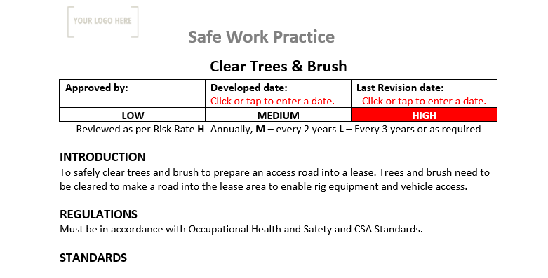 All Safe Work Practices & Code of Practices are sent in word formatting so they can be customized for your company.