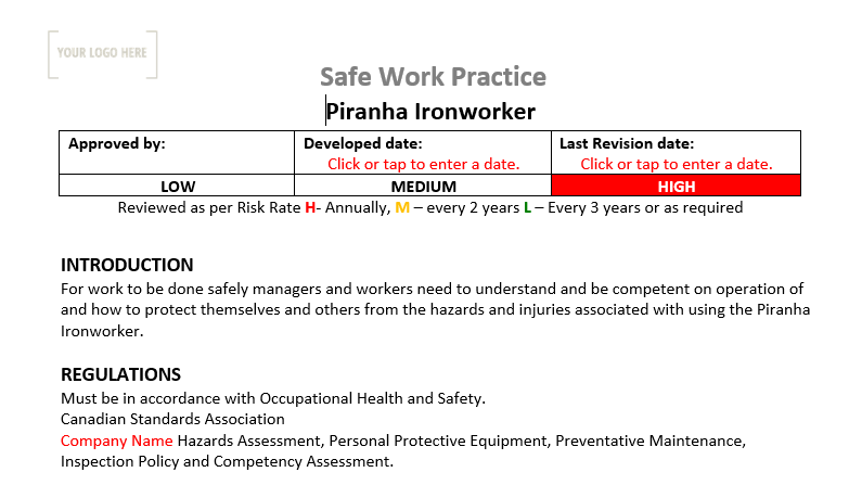All Safe Work Practices & Code of Practices are sent in word formatting so they can be customized for your company.