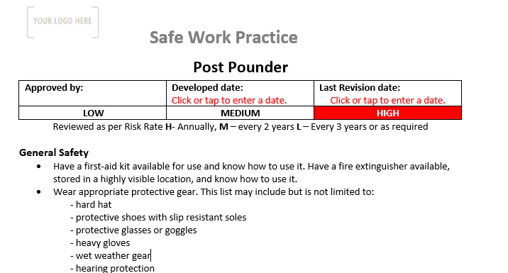 All Safe Work Practices & Code of Practices are sent in word formatting so they can be customized for your company.